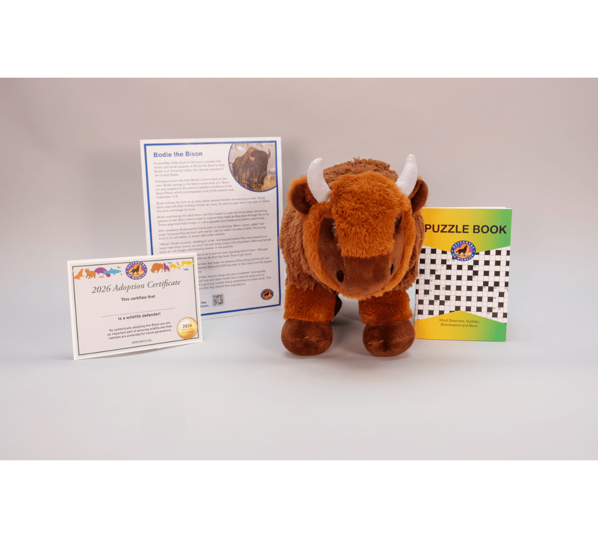 Bodie is an American bison, the national mammal of the United States. Bison once roamed from Alaska to Mexico. They still graze on the prairie today but live on only a fraction of their historic range. Habitat loss, illegal poaching, changes in climate and conflicts with humans are the biggest threats to bison. By adopting Bodie, you’re helping Defenders of Wildlife support bison recovery through collaboration with national parks, agencies and Native American tribes.