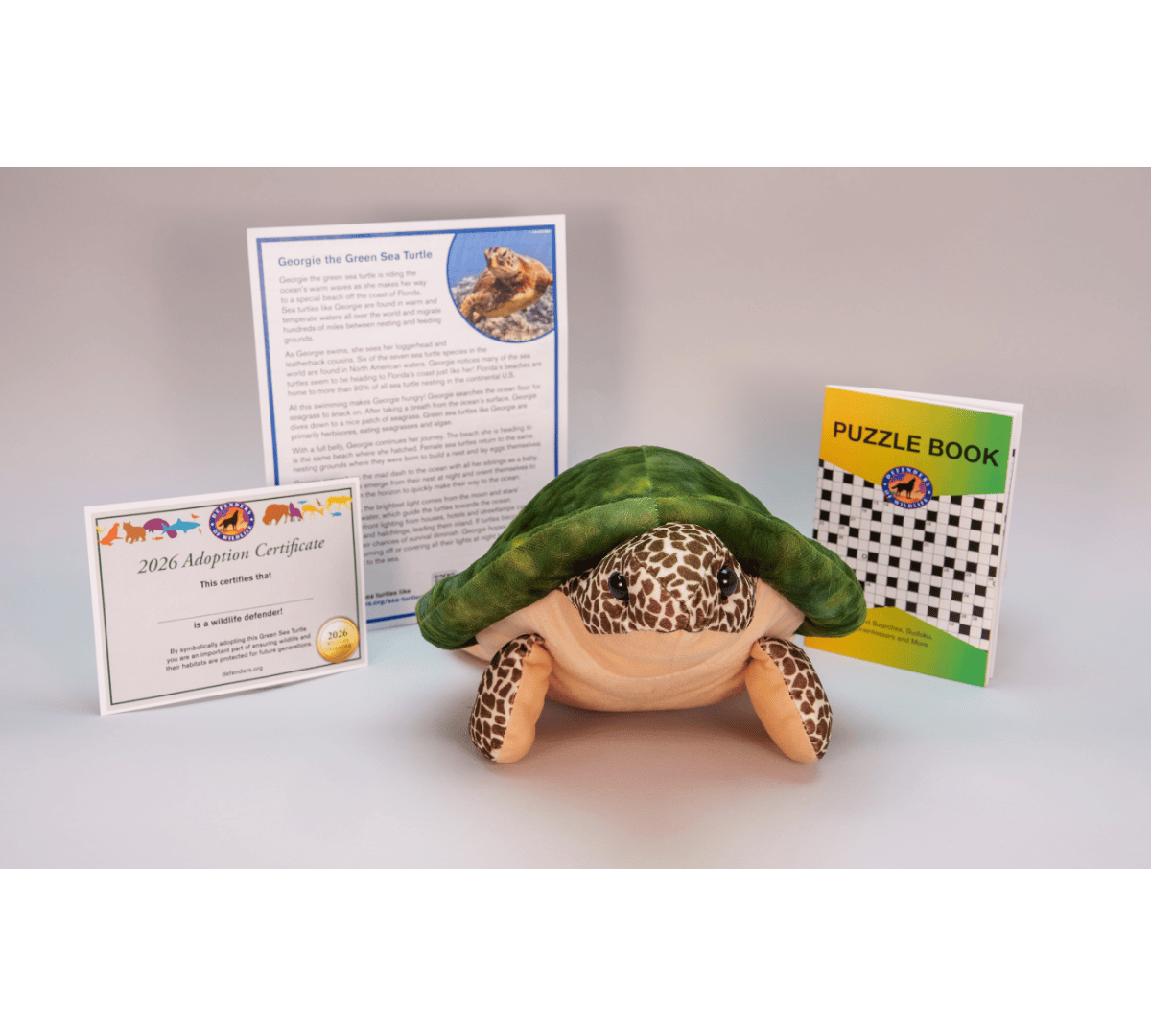 Georgie, a green sea turtle, is one of six sea turtle species found in North American waters. All of these turtles, including green sea turtles, are listed as endangered or threatened in the United States due, in part, to habitat loss, entanglement in marine debris, ingestion of plastics, artificial lighting and illegal harvesting. By adopting Georgie, you’re helping Defenders of Wildlife protect critical sea turtle habitat.